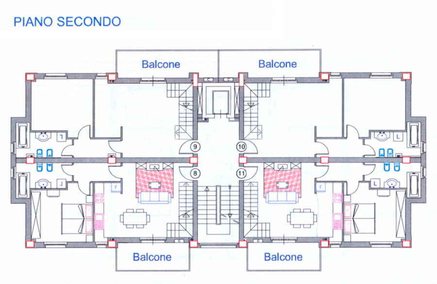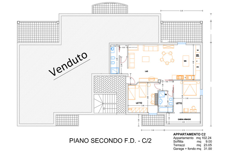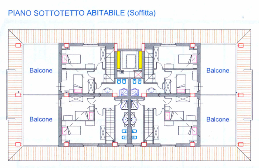 - P.1°: mq 111 camera matrimoniale con spogliatoio, camera matrimoniale, camera doppia, doppi servizi, ballatoio e ampie terrazze.Finiture di pregio.