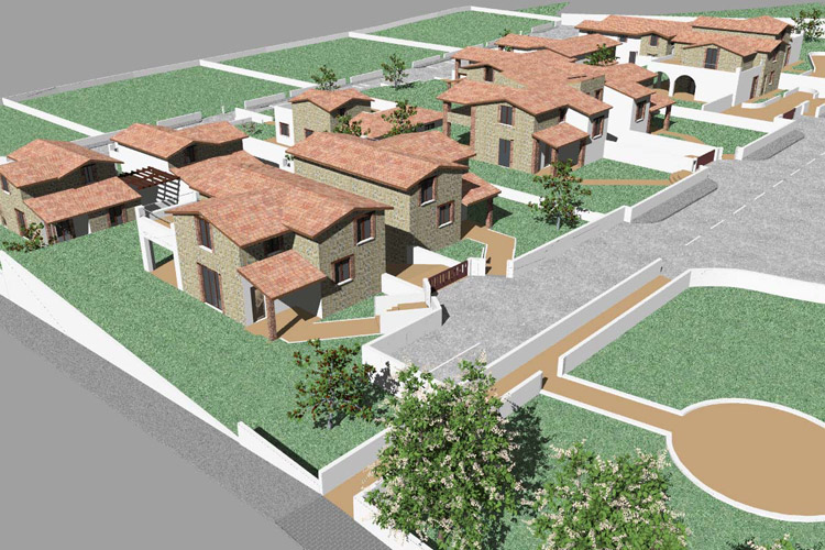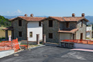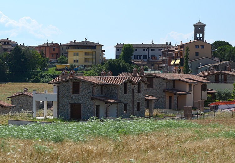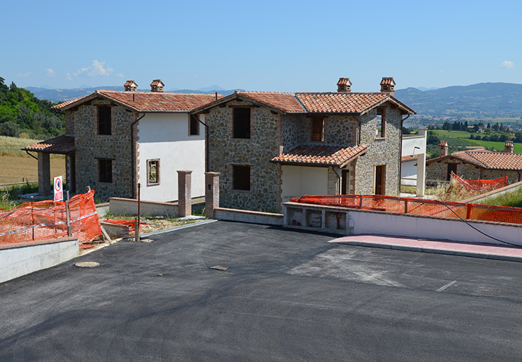 Molta attenzione è stata applicata nella ricerca dei materiali e tipologie costruttive di casolari Umbri. Le facciate esterne in parte rivestite in pietra arenarea antica, tipica dei luoghi, e in parte con intonaco e tinteggi. Il manto di copertura è stato realizzato usando il sistema della tegola piana e sovrastante coppo fatto a mano antico, I comignoli sono stati realizzati mantenendo le caratteristiche costruttive umbre usando mattoni fatti a mano di recupero. Gli sporti di gronda sono realizzati con travicelli di legno di castagno zampinati e sovrastante pianellato di pianelle fatte a mano. Ampi sono i giardini ad uso esclusivo.