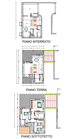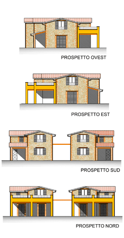 Il fabbricato “bifamiliare”e composto da due corpi di fabbrica distinti, colegati solo da un pergolato in legno, ogni unità abitativa si sviluppa su tre livelli: piano interrato, piano terra, piano sottotetto. Al piano terra, nella parte a valle, collegato al soggiorno, vi è un grande portico con archi a tutto sesto, mentre al piano sottotetto, sempre nella parte a valle vi è un grande terrazzo che domina la vallata.