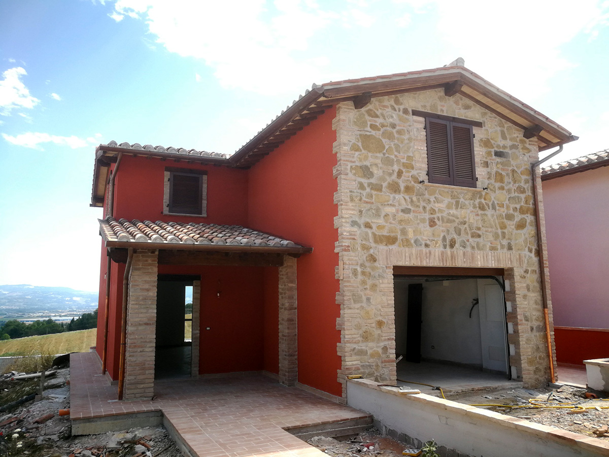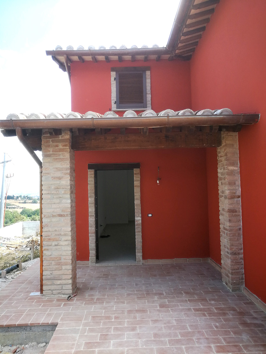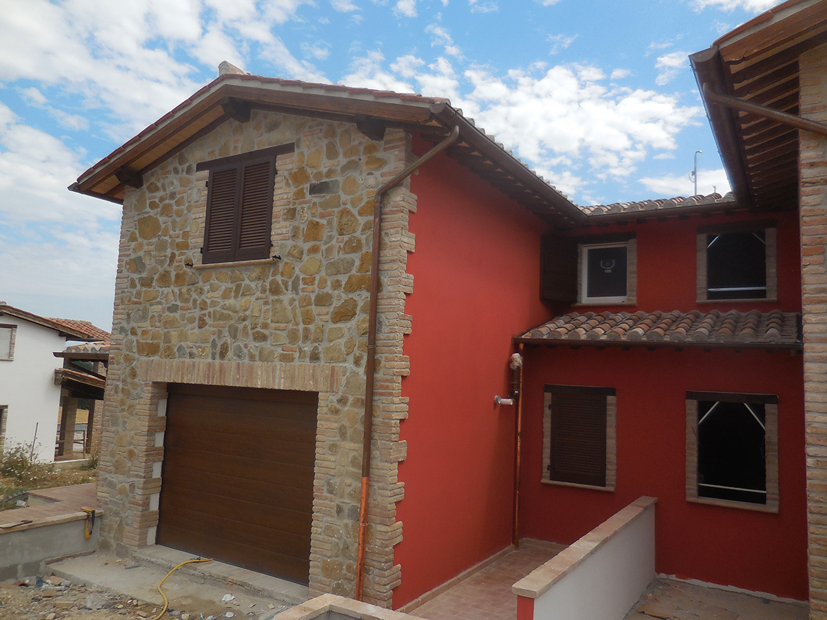 Molta attenzione è stata applicata nella ricerca dei materiali e tipologie costruttive di casolari Umbri. Le facciate esterne in parte rivestite in pietra arenarea antica, tipica dei luoghi, e in parte con intonaco e tinteggi. Il manto di copertura è stato realizzato usando il sistema della tegola piana e sovrastante coppo fatto a mano antico, I comignoli sono stati realizzati mantenendo le caratteristiche costruttive umbre usando mattoni fatti a mano di recupero. Gli sporti di gronda sono realizzati con travicelli di legno di castagno zampinati e sovrastante pianellato di pianelle fatte a mano. Ampi sono i giardini ad uso esclusivo.