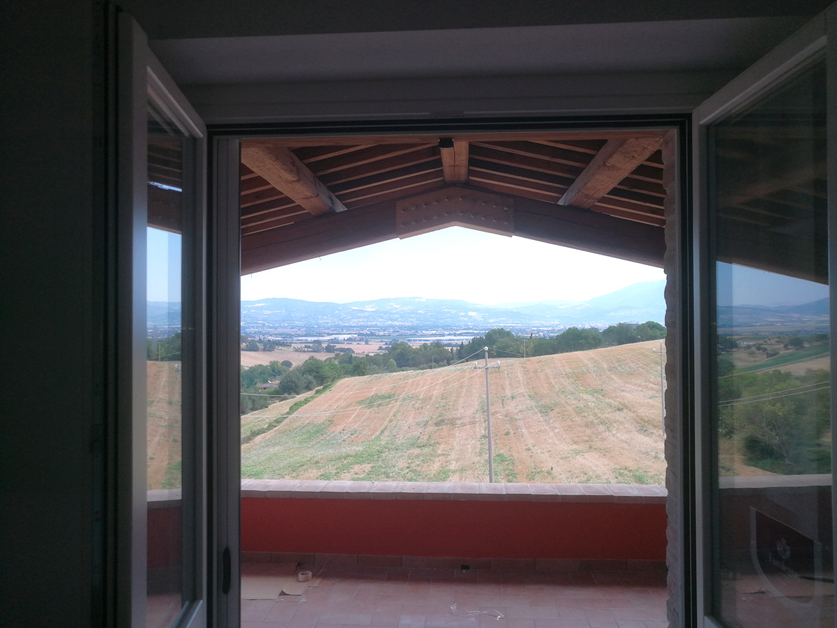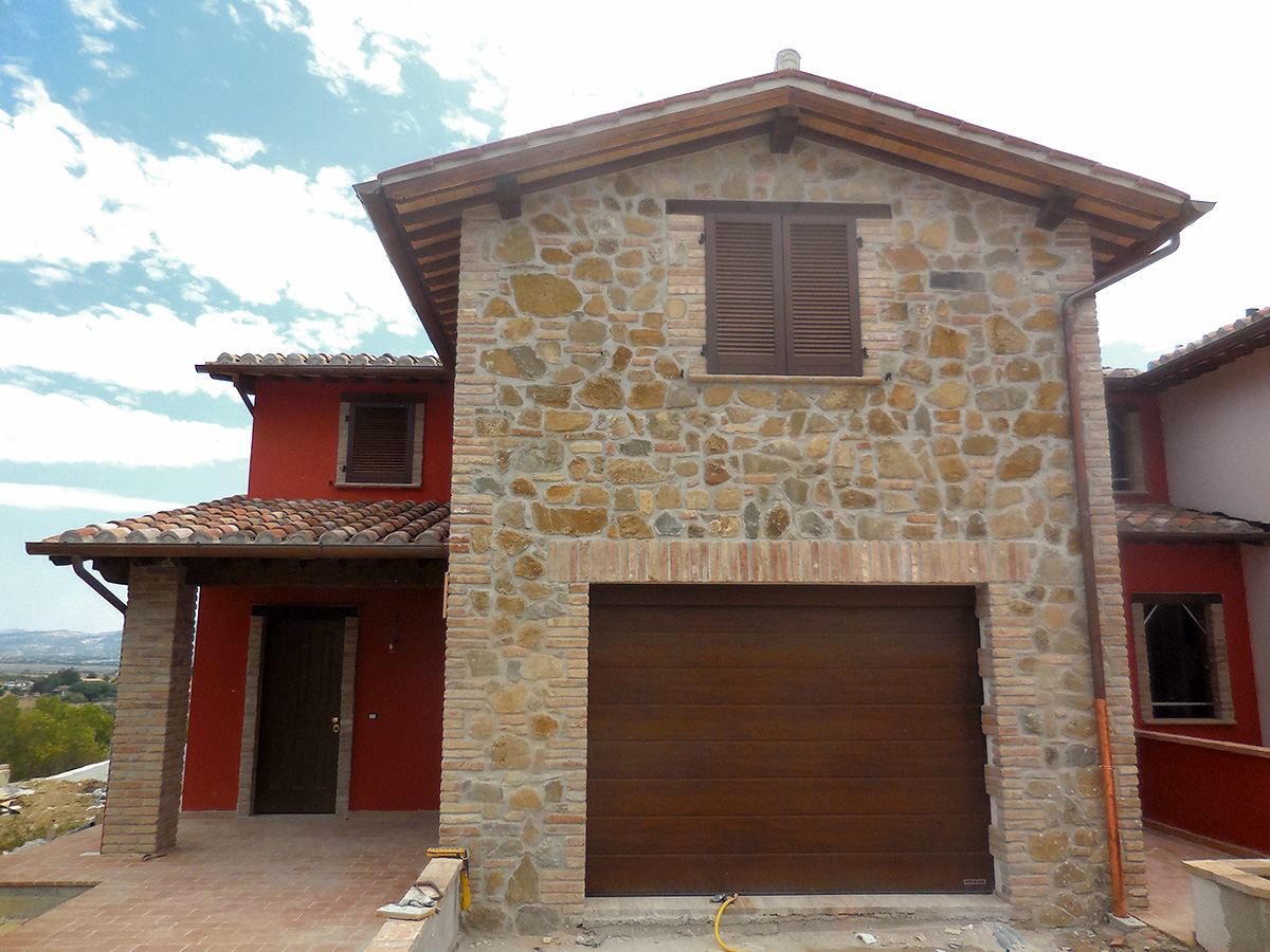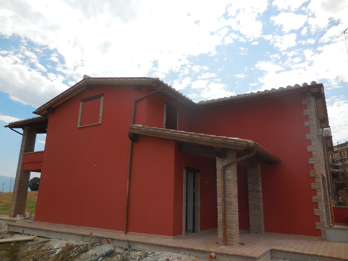 Molta attenzione è stata applicata nella ricerca dei materiali e tipologie costruttive di casolari Umbri. Le facciate esterne in parte rivestite in pietra arenarea antica, tipica dei luoghi, e in parte con intonaco e tinteggi. Il manto di copertura è stato realizzato usando il sistema della tegola piana e sovrastante coppo fatto a mano antico, I comignoli sono stati realizzati mantenendo le caratteristiche costruttive umbre usando mattoni fatti a mano di recupero. Gli sporti di gronda sono realizzati con travicelli di legno di castagno zampinati e sovrastante pianellato di pianelle fatte a mano. Ampi sono i giardini ad uso esclusivo.