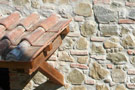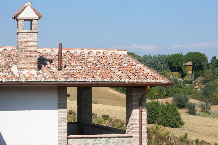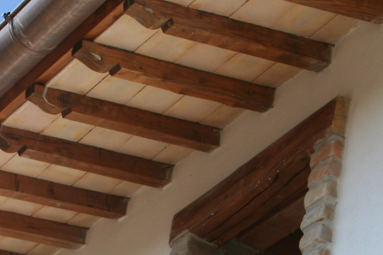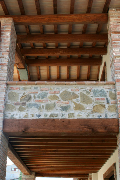 Tipologie costruttive del fabbricato: facciate intonacate e tinteggiatura ad effetto anticato, tutte le aperture esterne hanno delle riquadrate con mattoni fatti a mano, soglie delle finestre sono in pietra di travertino bianco, il manto di copertura con tegola portoghese anticata.
